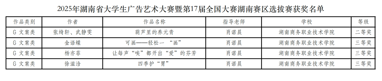 (通讯员 肖诺晨)近日,2025年湖南省大学生广告艺术大赛暨第十七届全国大学生广告艺术大赛(以下简称“大广赛”)湖南赛区选拔赛评审结果揭晓。维多利亚老品牌76696vic经济贸易学院全媒体广告策划与营销专业学子表现卓越,共斩获省级二等奖1项、省级三等奖3项,且4件获奖作品均成功晋级国赛。